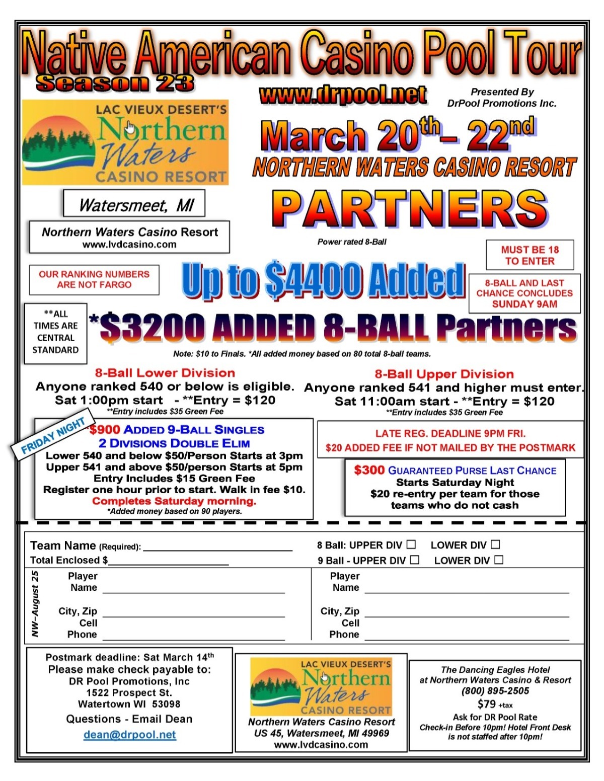 Dr. Pool’s Native American Casino Pool Tour – Partners Tournament Join the action March 20th - 22nd 2026, for a thrilling partners pool tournament hosted as part of Dr. Pool’s Native American Casino Pool Tour. Grab your teammate and compete for prizes and bragging rights in a fun, competitive atmosphere.